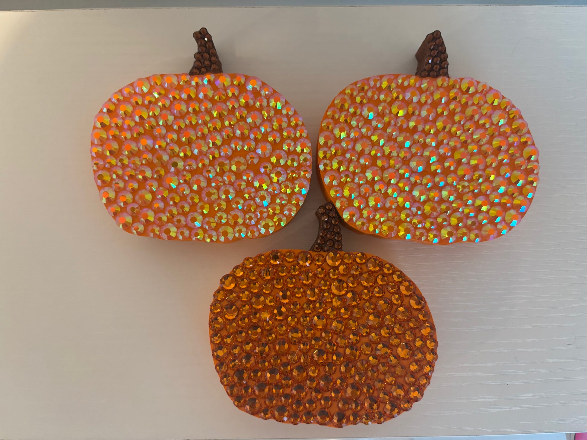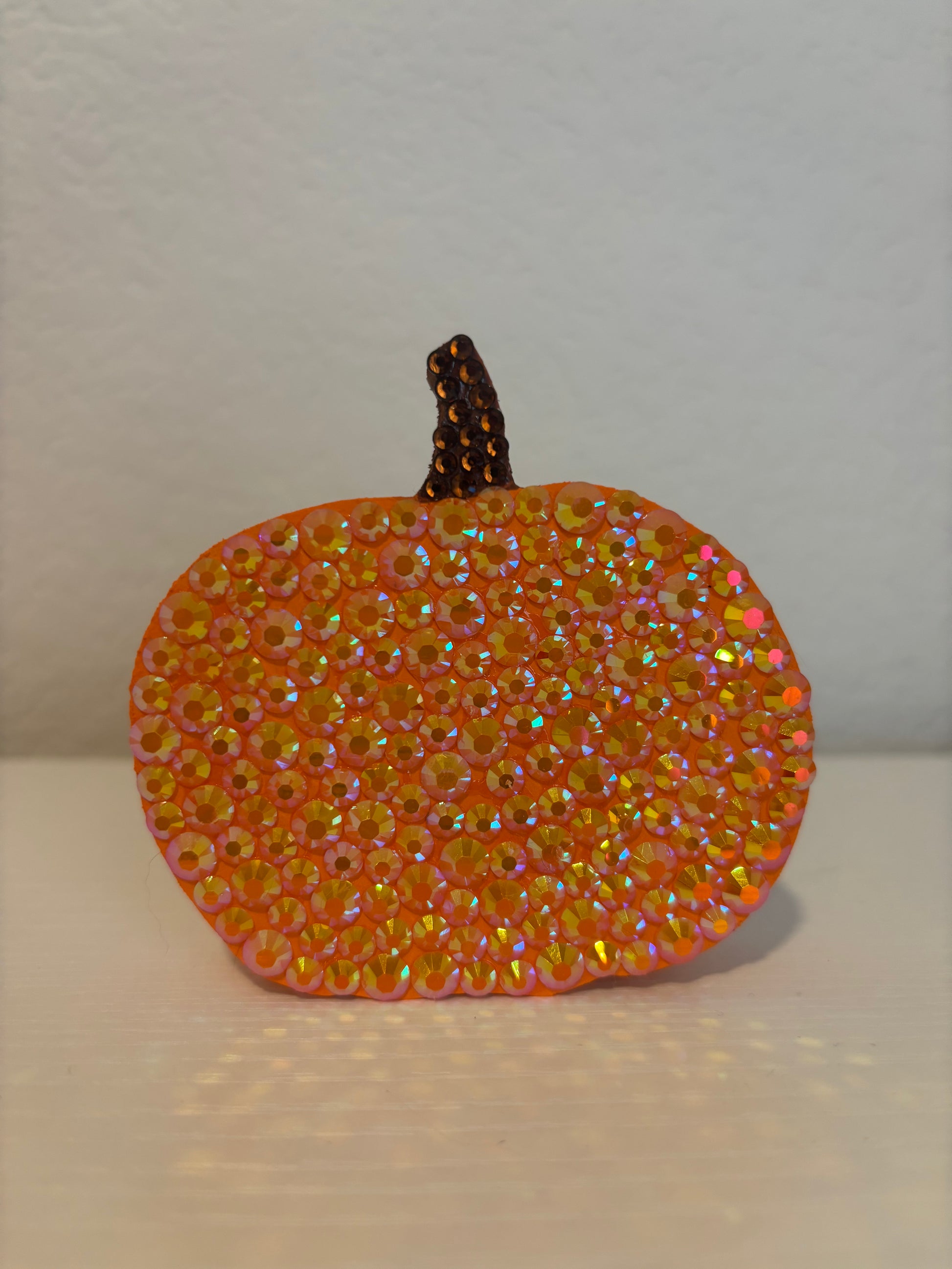 Bring some sparkle to your fall season with this handmade bedazzled pumpkin decoration! Covered in shimmering rhinestones, this stand-up pumpkin makes the perfect statement piece for your Halloween parties, autumn table décor, or glam farmhouse displays. Whether you style it on a mantel, shelf, entryway table, or centerpiece, this glittering pumpkin adds the perfect mix of cozy fall vibes and elegant sparkle.