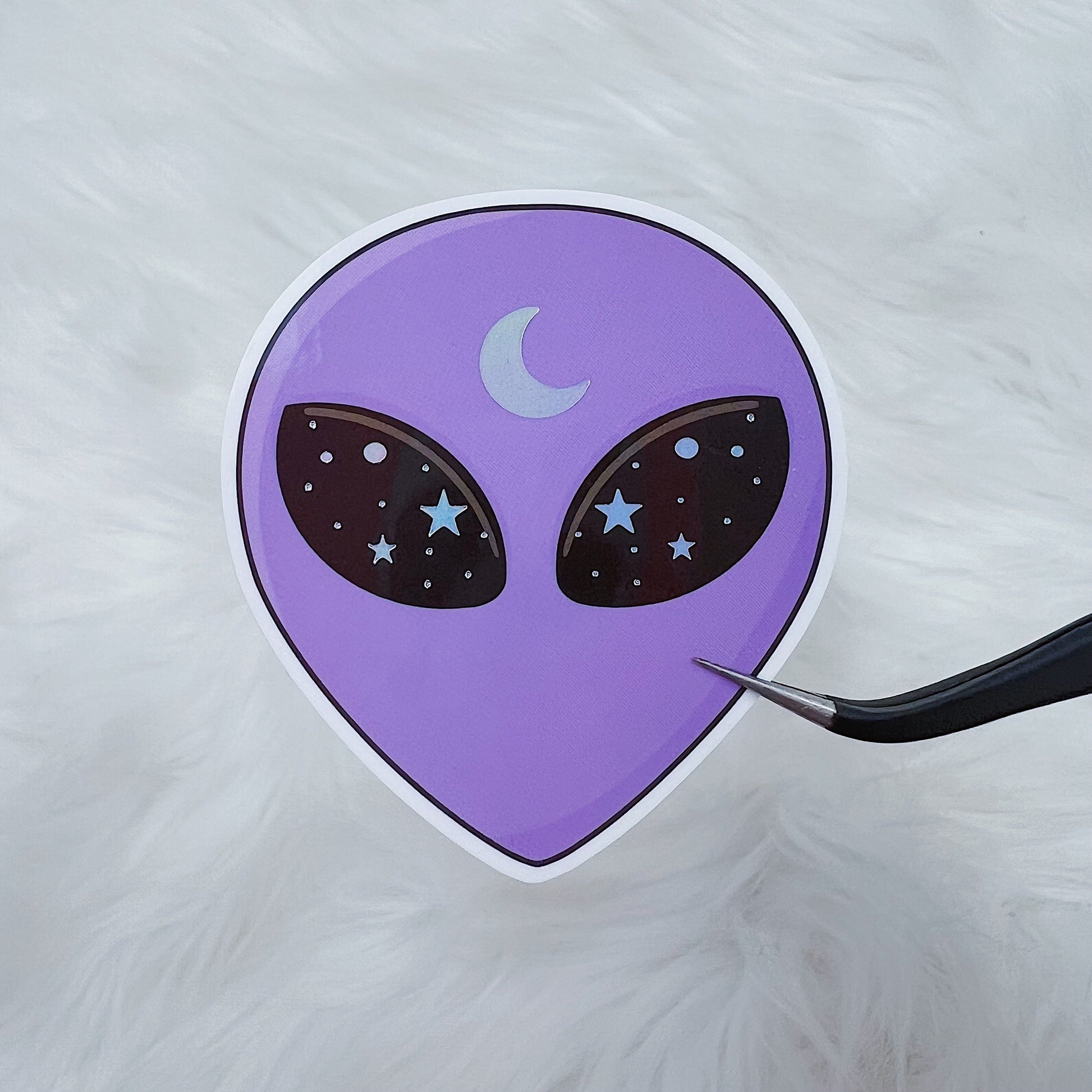 Elevate your sticker game with this Purple Alien Vinyl Sticker Die Cut! The holographic foiled design adds a touch of intergalactic shine to your belongings. Show off your quirky side with this playful and unique sticker. (Limited quantities available.)